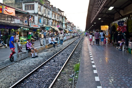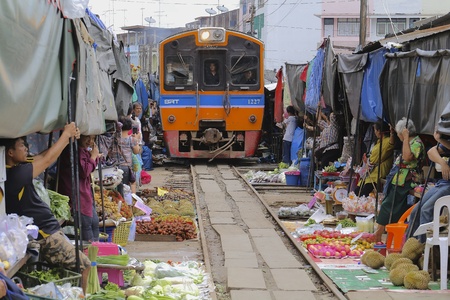 MAEKLONG, THAILAND-AUG 20 The famous railway markets at Maeklong, Thailand, August 20 th, 2012, Bangkok, Thailand Three times a day the train runs through these stalls