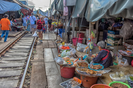 maeklong railway market 12.13.2018 Tourists visit the railway market outside bangkok and buy goods from the vendors