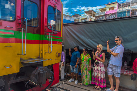 SAMUT SONGKHRAM, THAILAND - 07.07, 2019 : Tourists take photo at the train running through the most popular spot Talad Rom Hup or Umbrella market at Mae Klong railway station