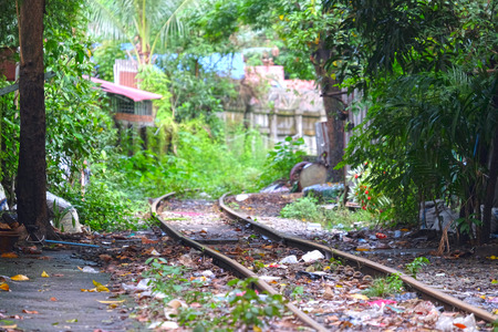 Never lose your sense of adventure. Rearview shot of a young couple walking on the train tracks through the streets of Vietnam.