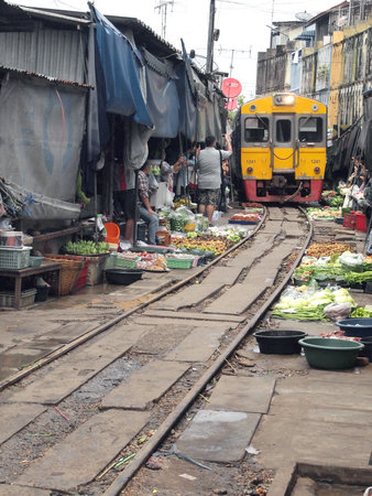 MAEKLONG, THAILAND - SEPTEMBER 7: The famous railway markets at Maeklong, Thailand, September 7, 2013, Samut Songkhram, Thailand.Three times a day the train runs through these stalls.