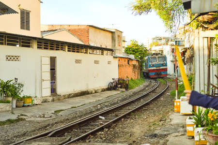 NIACHANG, VIETNAM - JANUARY 20, 2020: A blue train runs through the railway close to houses and retail outlets in the city of Nha Trang.