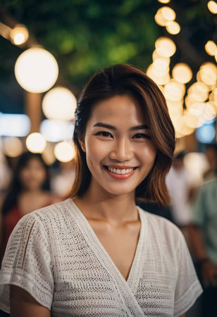 A joyful woman in Thailand beams with happiness against a backdrop of glowing lights at a lively evening gathering. Her bright smile radiates warmth and friendliness.