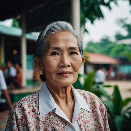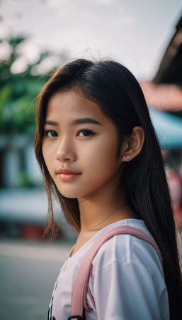A young girl residing in Thailand stands in a tranquil setting, smiling softly as she gazes into the distance.