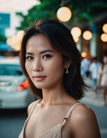 A young woman stands confidently in a vibrant street in Thailand during the evening, surrounded by glowing street lights and the buzz of city life, showcasing her stylish look and serene demeanor.