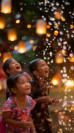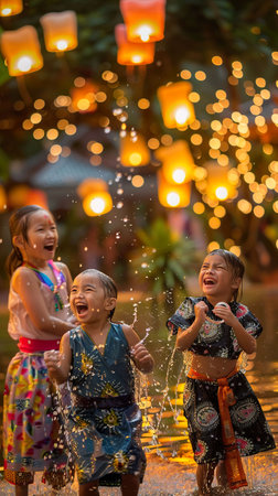 Children laughing, traditional Thai clothing, splashing water under the soft glow of lanterns, Songkran festival