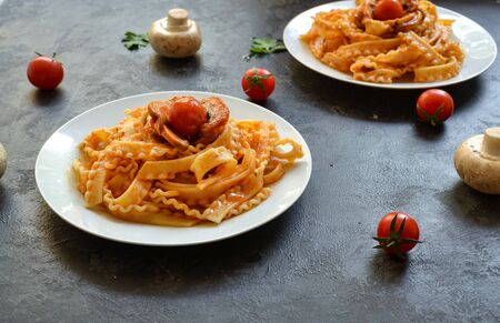 Pasta in a white plate. Pasta with tomato sauce, mushrooms with cherry tomatoes. Dark background. Free space for text. Delicious food