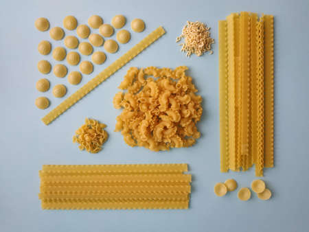 Different types of uncooked pasta, blue background with copy space. Healthy and vegan food.