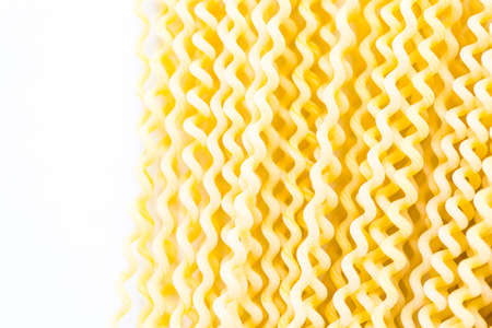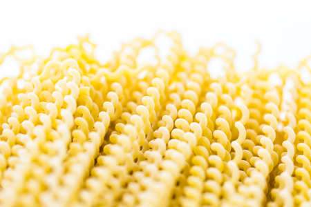 Yellow crisp macaroni isolated on the white marble background with copy space.