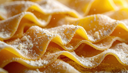Macro of fresh pasta lamination layers at cut edge subtle semolina dust representing artisan dough texture suitable for food packaging and editorial design