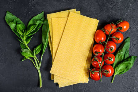 Raw lasagna sheets. Ingredients Basil, cherry tomatoes. Black background. Top view. Space for text.