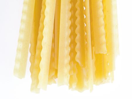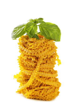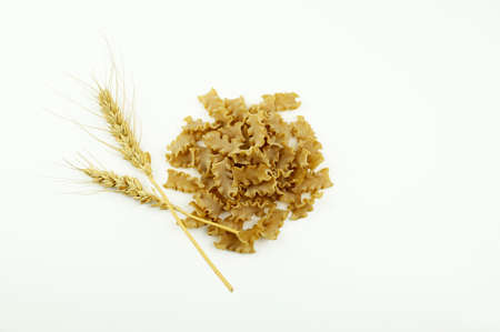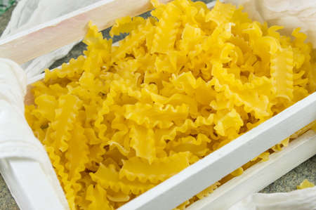Concept of italian pasta. Short Mafalda, wholemeal pasta on white background. Top view.