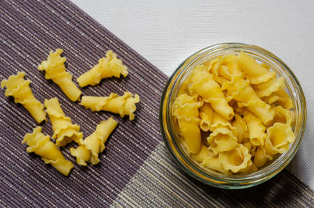 Gigli dry paste and glass jar on three-color textured background. Serving of uncooked pasta. Top view at an angle. Focus on the foreground.