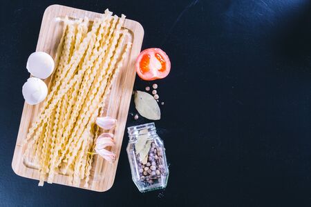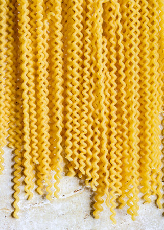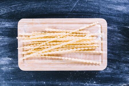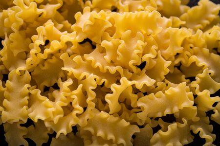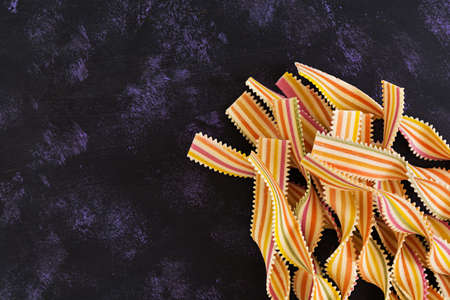 Concept of italian pasta. Short Mafalda, wholemeal pasta on dark background. Top view.
