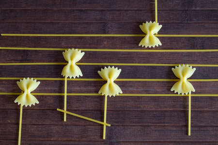 Background for advertising or restaurant furniture, musical score created on wooden table, the musical notes are created with raw paste in the shape of a bow tie, the lines of the score with spaghetti