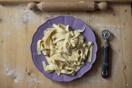 Raw homemade fresh pasta on purple plate before cooking, with cutting wheel and rolling pin