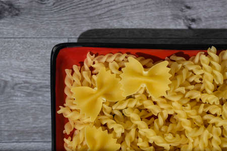 There are a lot of butterfly-shaped pasta on the table. Copy Space.