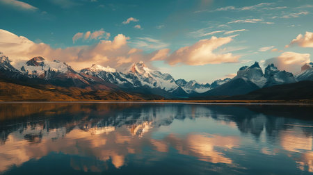 Breathtaking landscape showing majestic mountains and a serene lake reflecting a vibrant sky, encapsulating nature beauty and tranquility. Generated A.I.