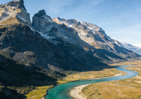 Amazing landscape at Torres del Paine, National park in Chile. Beautiful mountains and river
