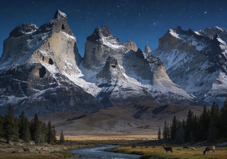 Mountain landscape with a river and snow-capped peaks at night