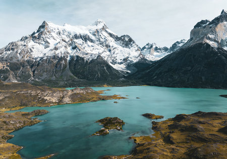 Landscape panorama of Lago del Pehoe in Torres del Paine national park, Patagonia, Chile.