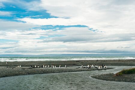 Colony of royal penguins on a background of ocean in chile