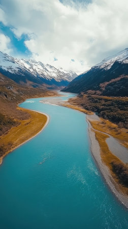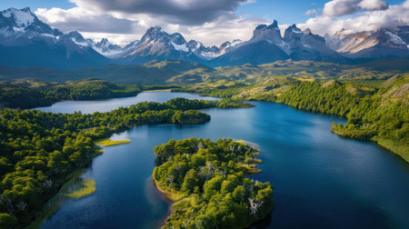 A captivating winding river flows through a picturesque landscape in Patagonia, framed by majestic snow-capped mountains and lush greenery under a bright sky.