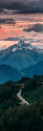 A winding road through a lush green forest leads to majestic snowy mountain peaks at sunset.