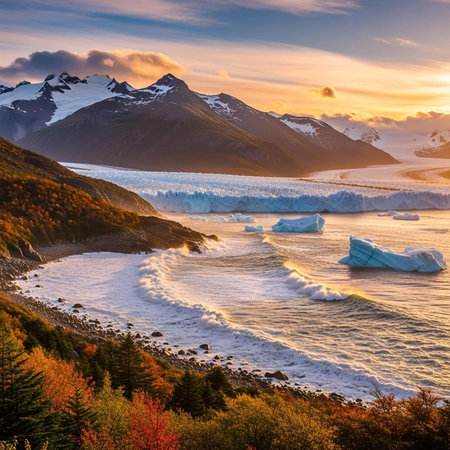 Vibrant sunset bathes icy peaks and a dwindling glacier in warm hues, capturing tranquil wilderness and evolving glacial beauty.