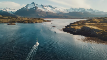 Aerial perspective showcases multiple boats gliding through the Beagle Channel, framed by breathtaking fjords and majestic mountains on a bright day.