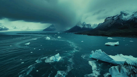 The southern tip of Patagonia showcases a rugged landscape where large icebergs drift in deep blue waters, surrounded by ominous storm clouds rolling in from the mountains.
