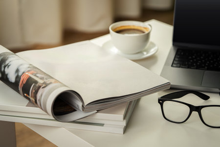 Modern Workspace With Laptop, Glasses, and Magazines