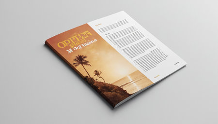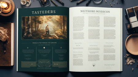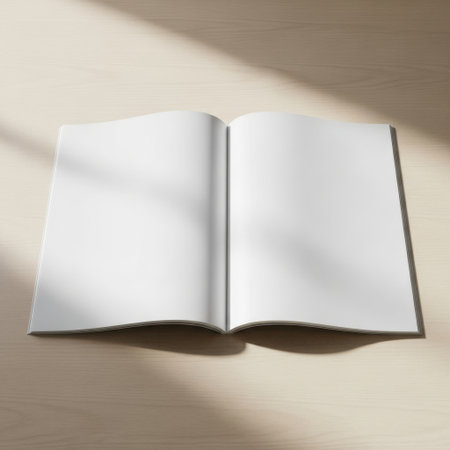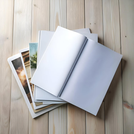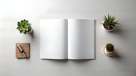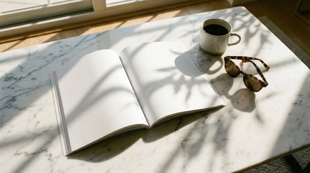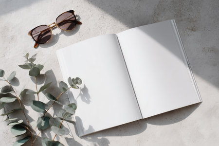 Top-down view of an open magazine with blank white pages lying on a table. Next to the magazine are sunglasses and a twig of a plant. AI-generated item