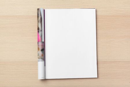 Open magazine on white wooden table. Mockup for design