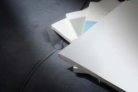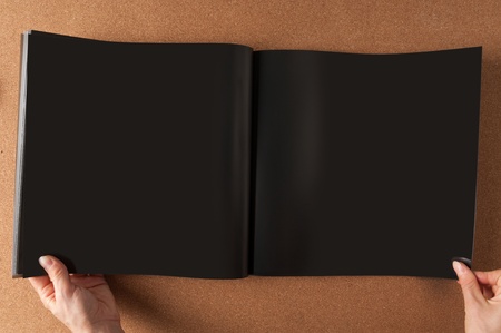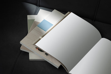 Mock-up magazine or catalog on black table. Blank page or notepad on paper background. Blank page or notepad for mockups or simulations.