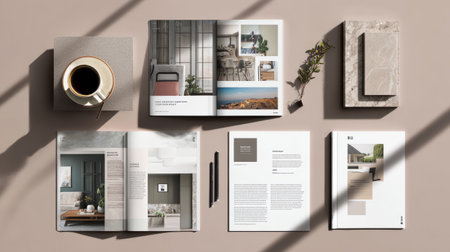 3D mockup of professional interior design portfolio template with structured layout, modern typography, soft natural lighting