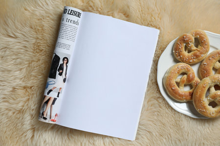Open magazine and pretzels on faux fur, top view. Mockup for design