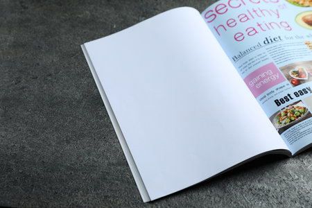 Open magazine on grey table, top view. Mockup for design