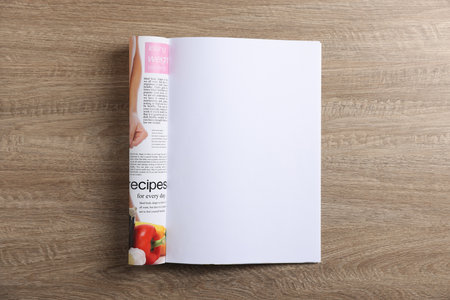 Open magazine on wooden table, top view. Mockup for design