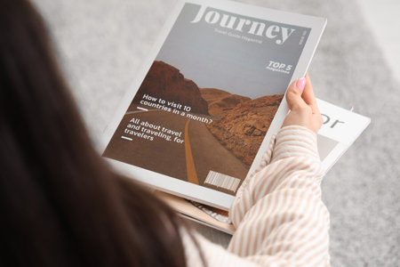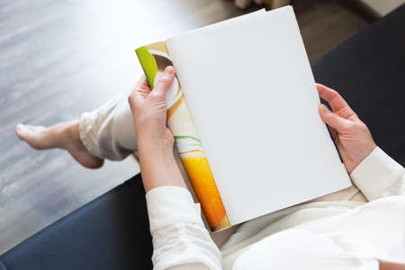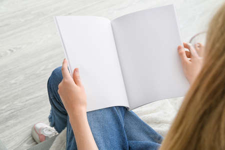 Woman reading blank magazine on light background