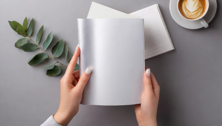 A professional mockup image featuring female hands holding a blank magazine against a gray backdrop. Ideal for branding projects, graphic design, advertising, or showcasing creative layouts.