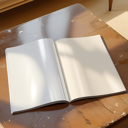 An open blank magazine with white pages rests on a distressed wooden table, bathed in natural light.