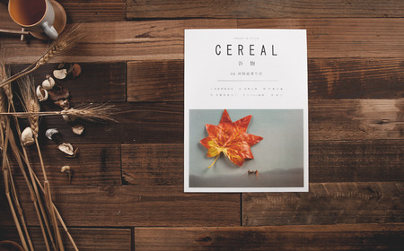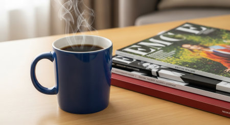 Coffee cup and magazine on the wooden table, stock photo