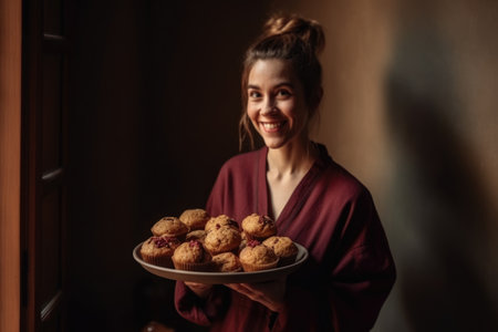 Joyful portrait of a woman holding a tray of freshly baked cranberry muffins in a cozy and inviting kitchen