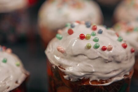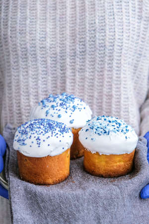 Hands hold Easter cake with white topping and blue sprinkles. Woman holding traditional Russian Easter cake. Homemade pie for spring holiday celebration