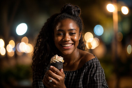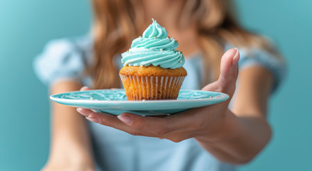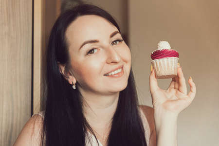 sweet food and people concept. summer fashionable woman wearing pink shirt holds cake cupcake in hand closeup