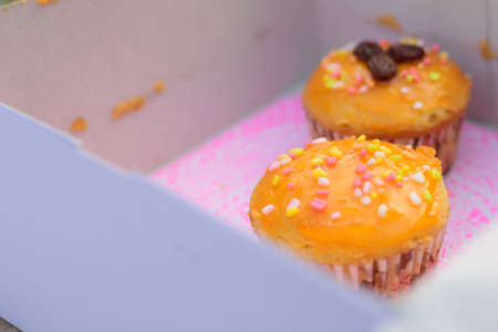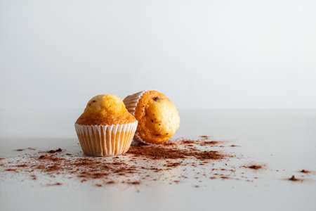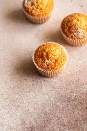 Sweet muffins with powdered sugar. homemade bakery. Muffins in white capsules.