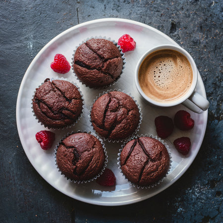 Chocolate muffins lie on a white plate with small hearts. Close-up, space for an inscription