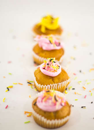 Cupcake decorating with sprinkles. Use for baking blogs, dessert recipes, party themes, food photography, sweet treats, celebration ideas.