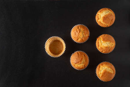 Still life with a top view of a group of cupcakes with one of the empty containers, placed in a triangular shape, on a dark background.